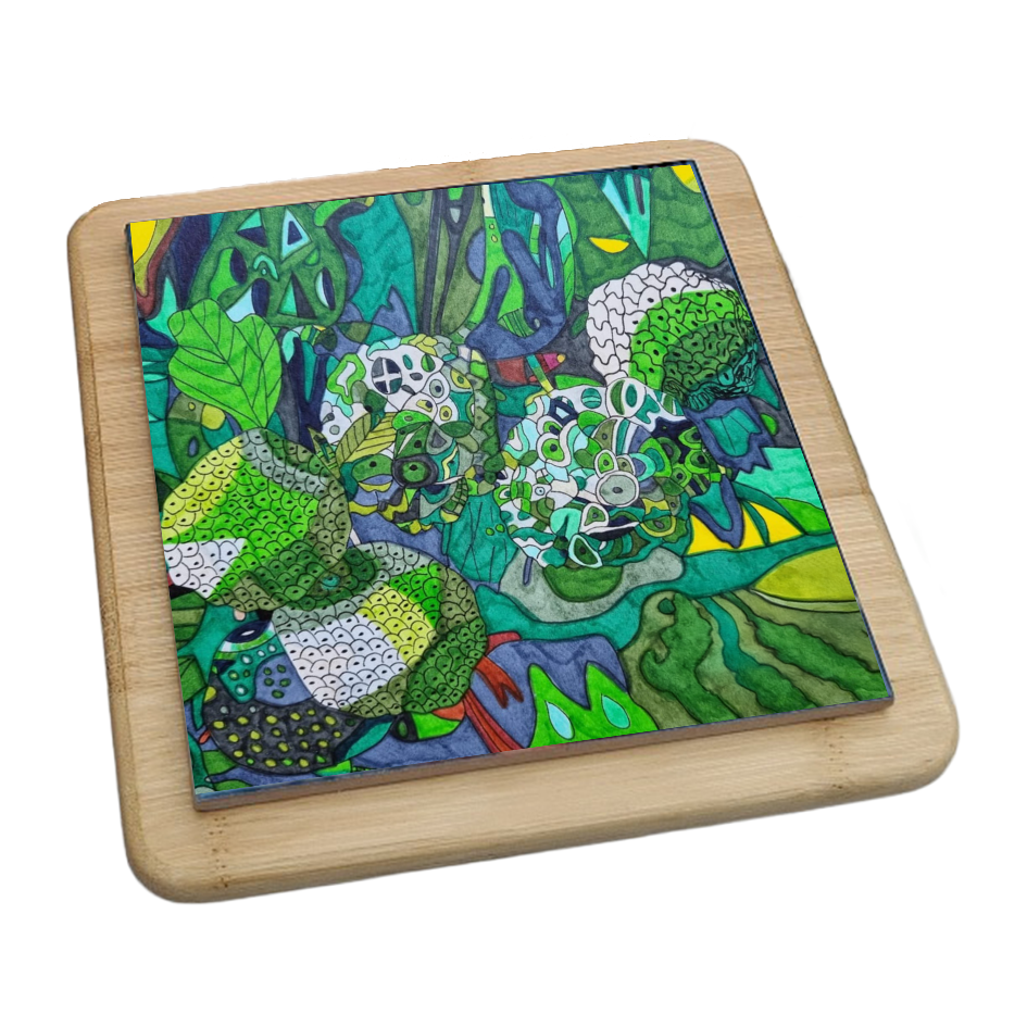 תחתית סיר איכותית מבמבוק טבעי בגודל 18×18 ס"מ, עם אריח מצויר מבית HUB-ility.