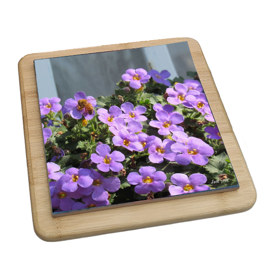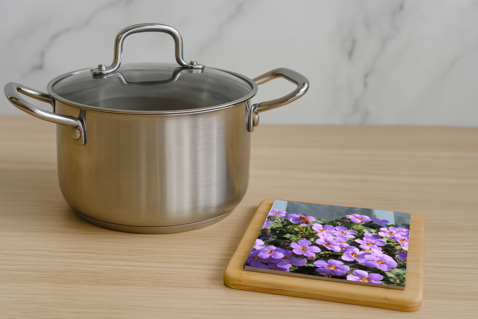 תחתית סיר איכותית מבמבוק טבעי בגודל 18×18 ס"מ, עם אריח מצויר מבית HUB-ility.